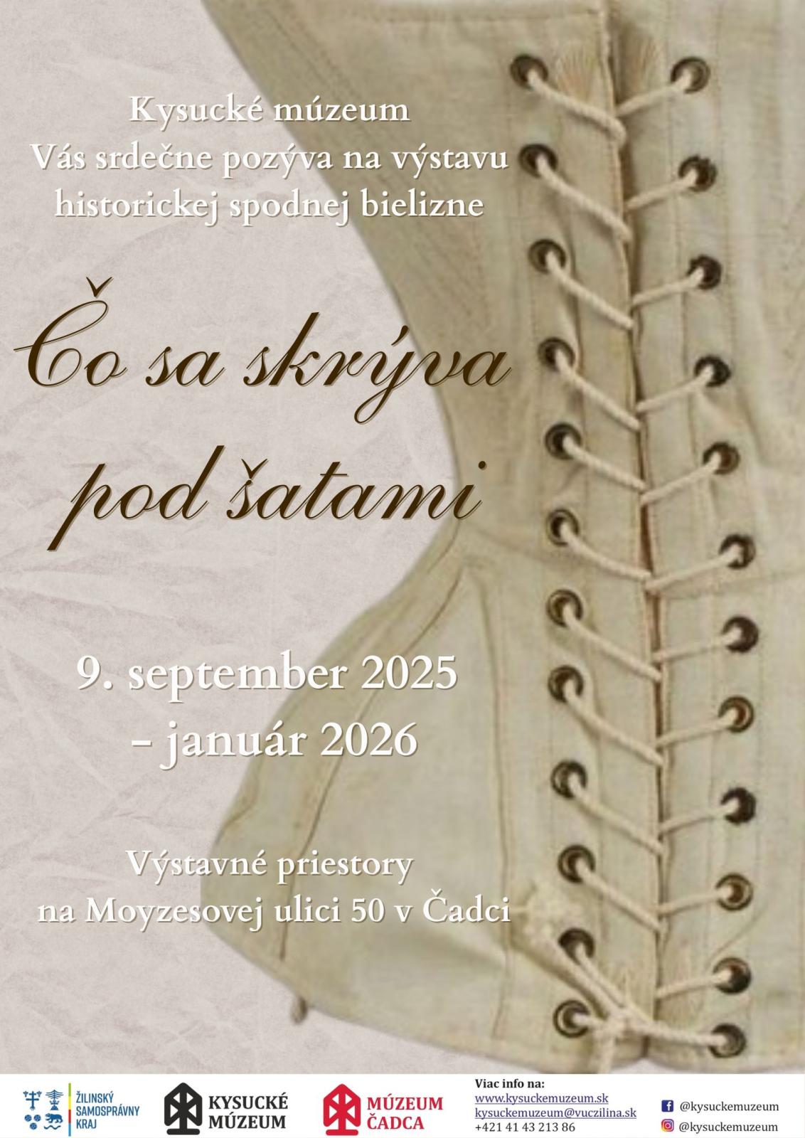 Výstava prezentuje históriu spodnej bielizne zhruba do 50-tych rokov 20. storočia, elegantné aj každodenné kúsky, ktoré tvorili súčasť šatníka dám z vyššej spoločnosti v mestách, ale aj obyčajných žien z dedín. Nezabúda sa ani na pánov, sú tu originály, ale aj repliky toho, čo nosili muži.