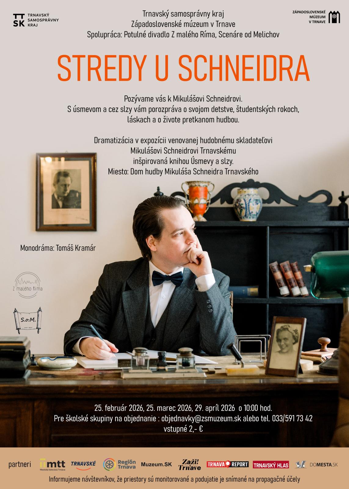 Podujatie Stredy u Schneidra je určené pre žiakov II. stupňa ZŠ alebo študentov stredných škôl a bude sa konať v termínoch: 25. februára 2026, 25. marca 2026 a 29. apríla 2026 o 10:00 hod. v Dome hudby Mikuláša Schneidra Trnavského (Ul. Mikuláša Schneidra Trnavského č. 5, Trnava).