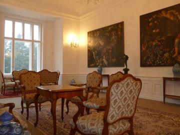 Počas prehliadky si návštevníci môžu pozrieť niekoľko miestností zariadených predmetmi, ktoré boli predtým súčasťou Domova slovenských spisovateľov, ako aj zbierkovými predmetmi zo SNM-Múzea Červený Kameň. V oboch prípadoch ide o exponáty, ktoré pochádzajú zo zvozov Národnej kultúrnej komisie z opustených a znárodnených šľachtických sídel po druhej svetovej vojne - žiaden z predmetov nepatrí k pôvodnému zariadeniu kaštieľa spred roka 1945.