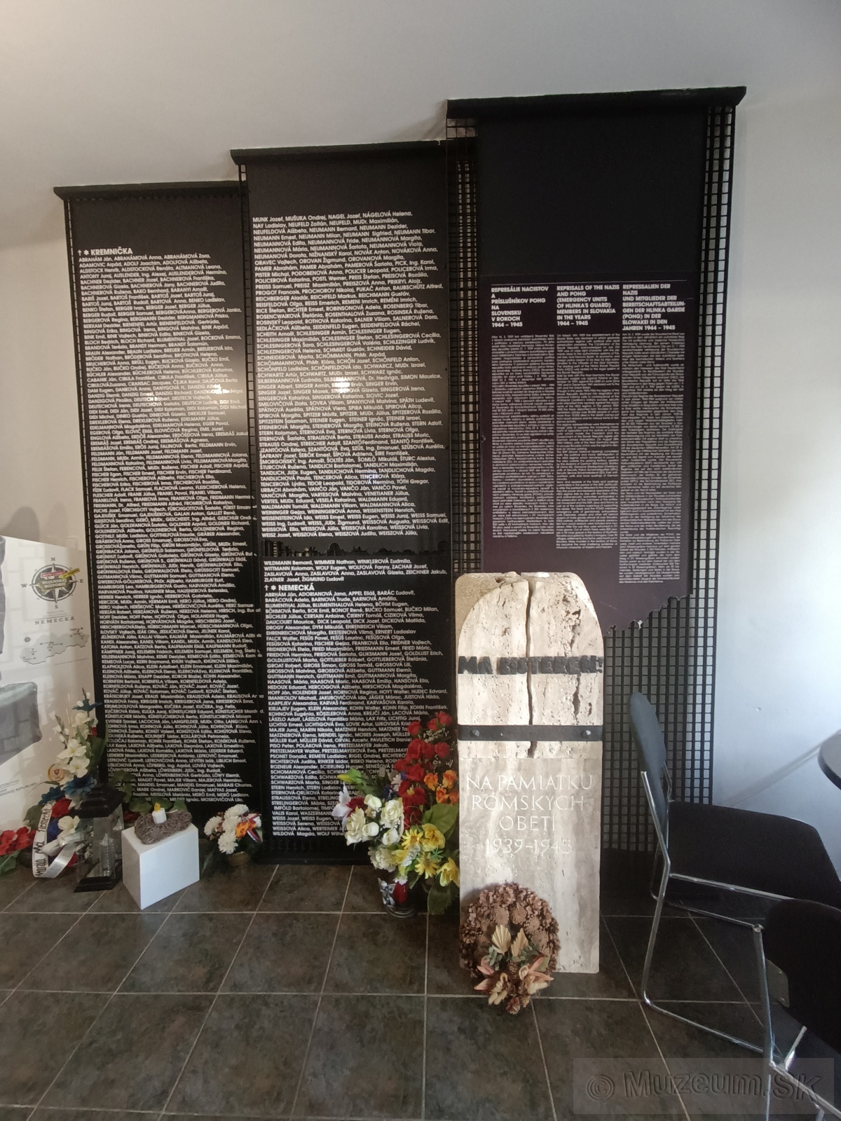 V druhej časti expozície, ktorá zaberá ďalšiu samostatnú miestnosť máte možnosť oboznámiť sa s rozsahom represálií na západnom, strednom a východnom Slovensku ako aj na územiach okupovaných hortyovským Maďarskom. Časť expozície je venovaná represáliám voči rómskemu obyvateľstvu. Najväčší masový hrob na západnom Slovensku bol nájdený v lokalite Brezina pri Trenčíne, na strednom Slovensku v Dolnom Turčeku a na východe republiky v Tokajíku.