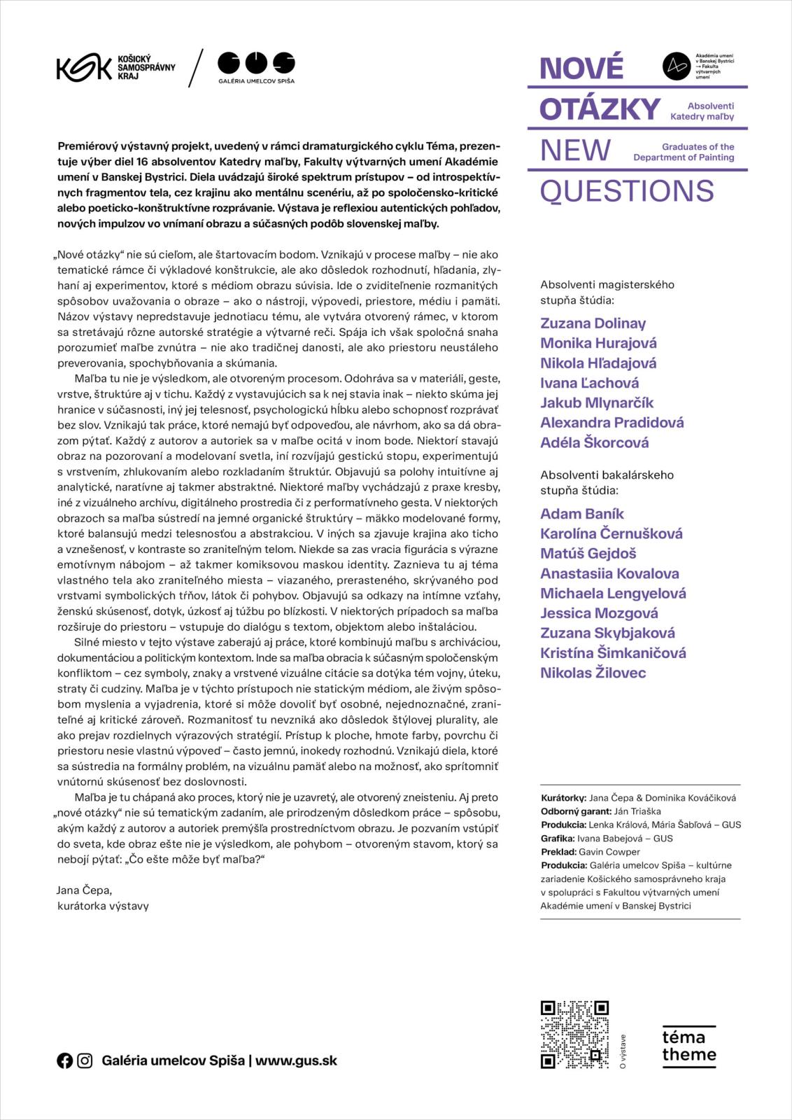 Maľba je tu chápaná ako proces, ktorý nie je uzavretý, ale otvorený zneisteniu. Aj preto „nové otázky“ nie sú tematickým zadaním, ale prirodzeným dôsledkom práce – spôsobu, akým každý z autorov a autoriek premýšľa prostredníctvom obrazu. Je pozvaním vstúpiť do sveta, kde obraz ešte nie je výsledkom, ale pohybom – otvoreným stavom, ktorý sa nebojí pýtať: Čo ešte môže byť maľba?