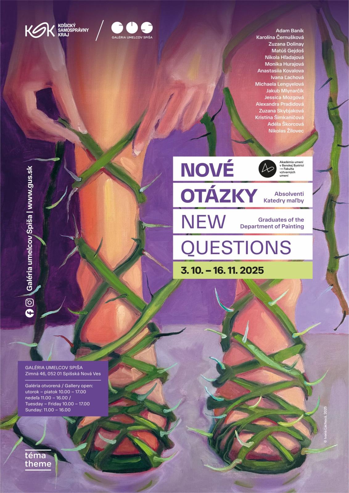 „Nové otázky“ nie sú cieľom, ale štartovacím bodom. Vznikajú v procese maľby – nie ako tematické rámce či výkladové konštrukcie, ale ako dôsledok rozhodnutí, hľadania, zlyhaní aj experimentov, ktoré s médiom obrazu súvisia. Ide o zviditeľnenie rozmanitých spôsobov uvažovania o obraze – ako o nástroji, výpovedi, priestore, médiu i pamäti. Názov výstavy nepredstavuje jednotiacu tému, ale vytvára otvorený rámec, v ktorom sa stretávajú rôzne autorské stratégie a výtvarné reči. Spája ich však spoločná snaha porozumieť maľbe zvnútra – nie ako tradičnej danosti, ale ako priestoru neustáleho preverovania, spochybňovania a skúmania.