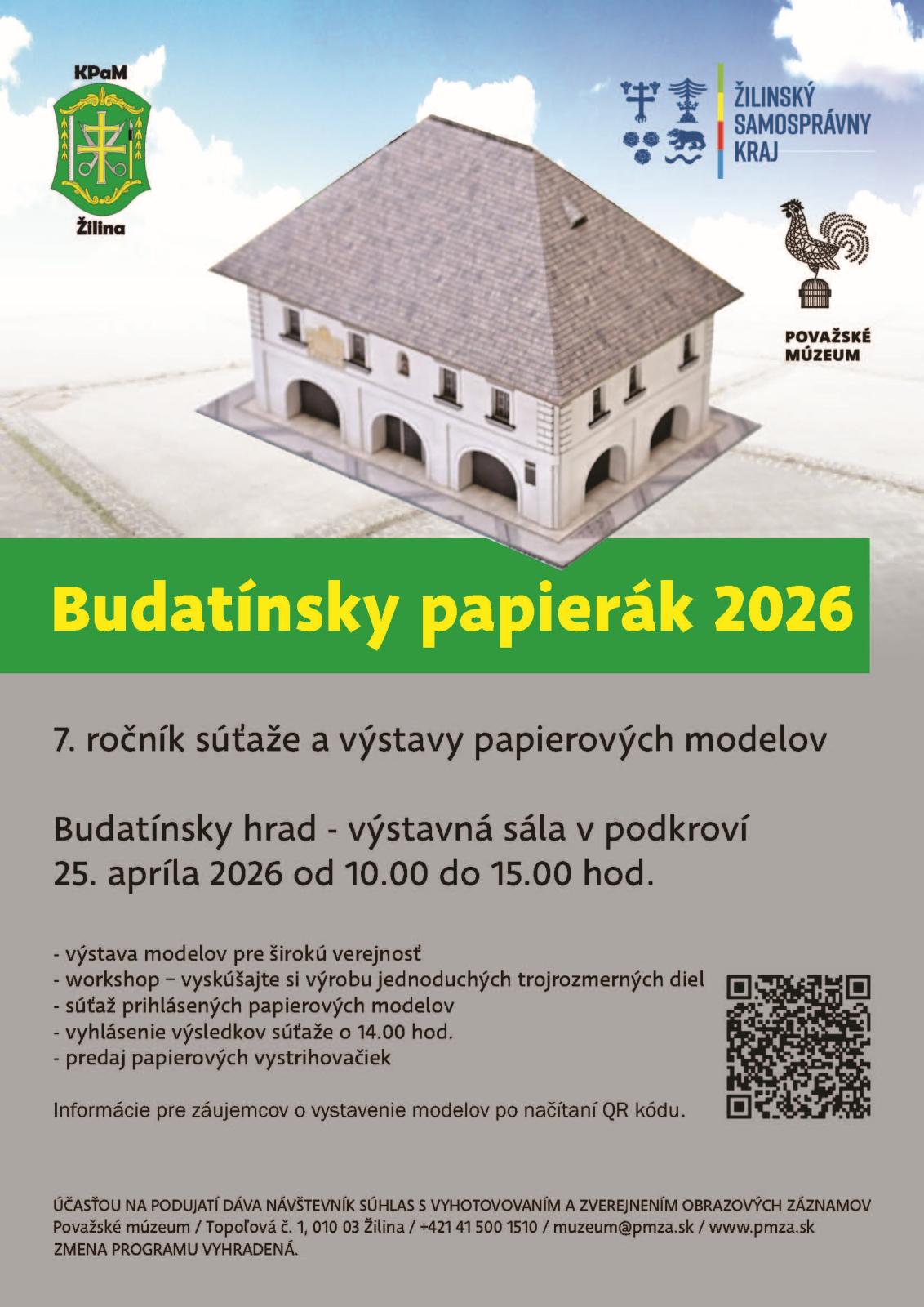 Siedmy ročník súťaže a výstavy papierových modelov sa bude konať 25. apríla od 10.00 do 15.00 v podkroví Budatínskeho hradu. Príďte sa pozrieť na výstavu papierových modelov a vyskúšajte si tvorbu jednoduchých trojrozmerných diel na workshope pod vedením skúsených modelárov. Súčasťou je aj súťaž o najkrajší model. Na mieste bude možnosť zakúpenia papierových vystrihovačiek.