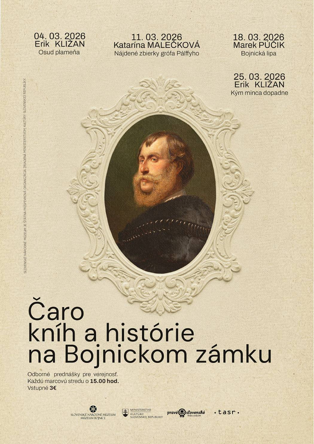Počas marca vás preto pozývame na sériu odborných popularizačných prednášok, ktoré sa budú konať každú stredu priamo v autentickom prostredí Bojnického zámku. Odborní pracovníci múzea vám osobne predstavia témy svojich kníh a výskumov, priblížia zákulisie výskumu a odhalia zaujímavosti, ktoré sa do bežných prehliadok často nezmestia.