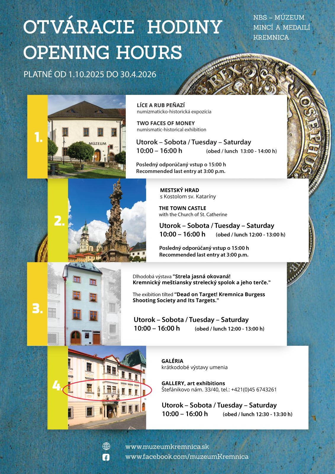 Podrobnejšie informácie o otváracích hodinách NBS - Múzea mincí a medailí Kremnica je možné nájsť na webovej stránke www.muzeumkremnica.sk.