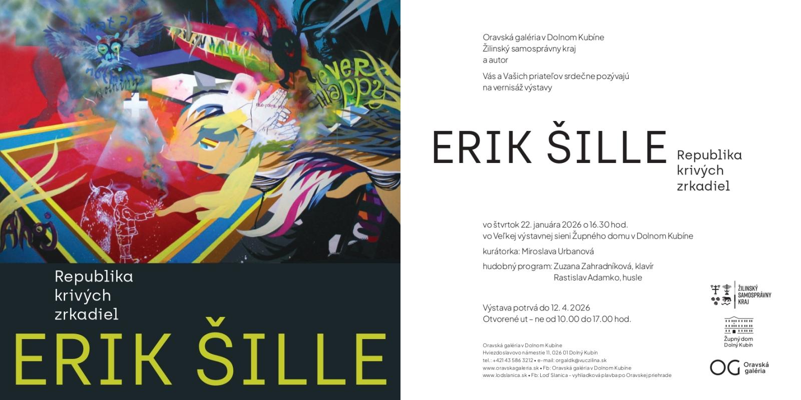 Výstava Republika krivých zrkadiel predstavuje výber z prevažne maliarskej tvorby Erika Šilleho od neskorých nultých rokov. V časozbernom reze ukazuje, ako sa do obrazov zapisuje postupný rozklad predstavy dejín ako smerovania k spravodlivejšiemu svetu – a ako sa do verejného priestoru vracajú ozveny nacionalizmu, agresívnej rétoriky a polarizácie spoločnosti. Dôležitý je pritom čas vzniku diel: ich datovanie nie je len informáciou, ale kľúčom k čítaniu. Dnes totiž tieto obrazy pôsobia inak – a často naliehavejšie – podľa toho, ktorú tematickú linku si divák zvolí.